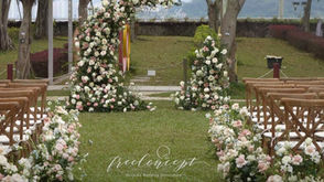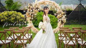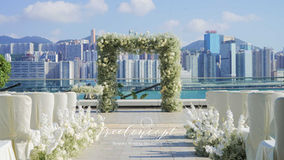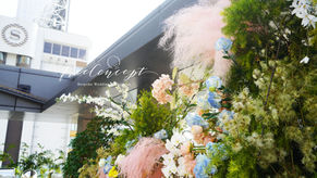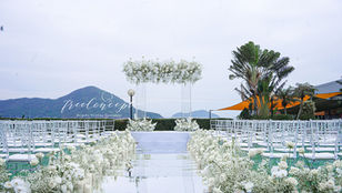 This gorgeous acrylic arch featuring different flowers seems as it's elevated weightlessly. So clean and modern, really focusing on the scenery and beautiful landscape. A big cluster of fresh flowers with- Rose. White Eustoma, Peonies, white Rocket Larkspur, and Hydrangea. Artificial flowers, when mixed with real stems and arranged tastefully, can work wonders.
