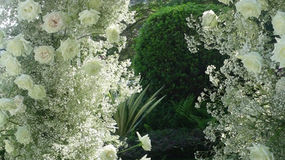 The basic idea is a dreamlike arch made entirely of fresh flowers, with a predominant color scheme of pink and white baby's breath