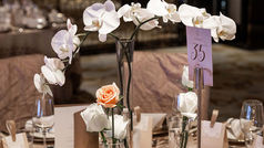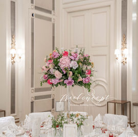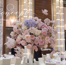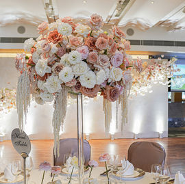 A tall rose centerpiece is a popular and elegant floral arrangement that features long-stemmed roses arranged in a vertical display. The roses are typically arranged in a tall vase or container and can be mixed with other flowers, such as hydrangeas or lilies, or with greenery, The colors of the roses can be coordinated with the overall color scheme of the event or can be a mix of complementary hues. The height of the centerpiece can be adjusted to suit the size of the table or room and can be a dramatic focal point of the decor.