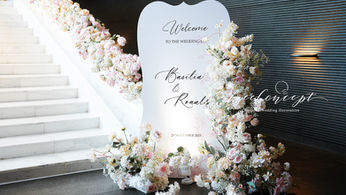 Flower vines hanging inside, a tall welcome sign suitable for a large banquet venue with eye-catching decoration design